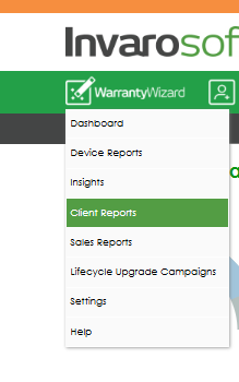 Hover over Warranty Wizard in the header and select Client Report from the dropdown menu.