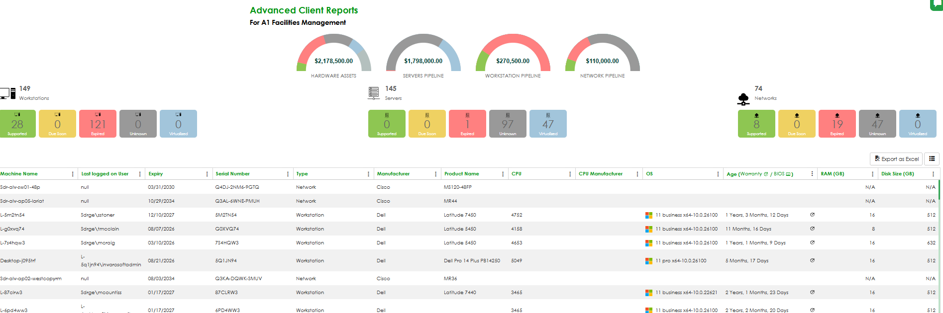 The Client Report view displays a list of customers with a general overview, including: Total number of devices, Estimated total value, Status bar showing an approximate breakdown.